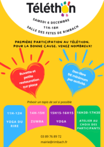 Pour sa première participation au Téléthon, la commune de Rimbach vous propose de se retrouver à la salle des fêtes pour un moment convivial de 11h à 18h.